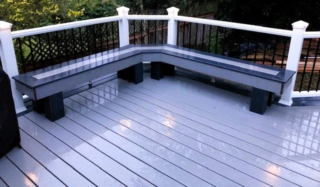 Custom Composite TimberTech Azek deck with seating benches built by Petra Decks in Kent, WA