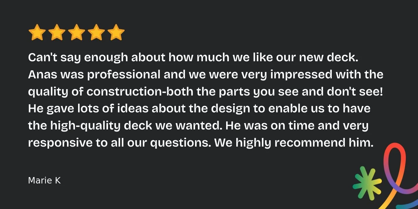 From managing permits and timelines to clear communication, we handle all the details so you can relax and enjoy your new deck.Client Satisfaction Guaranteed